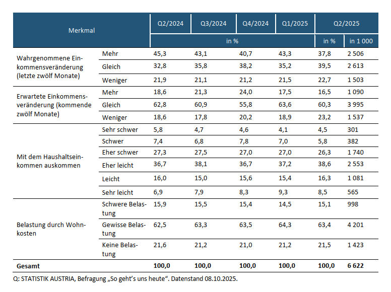 23 Prozent gaben in der Erhebung der Statistik Austria an, innerhalb der vergangenen zwölf Monate Einkommensverluste erlitten zu haben – etwa gleich viele wie im Vergleichsquartal 2024 (22 Prozent).